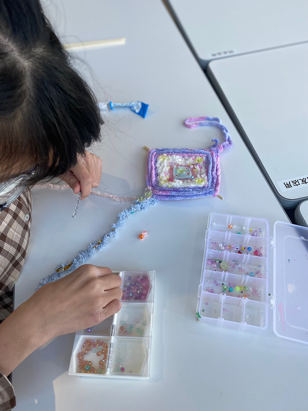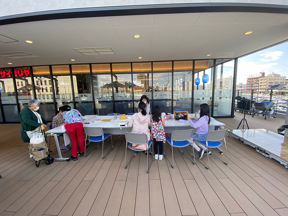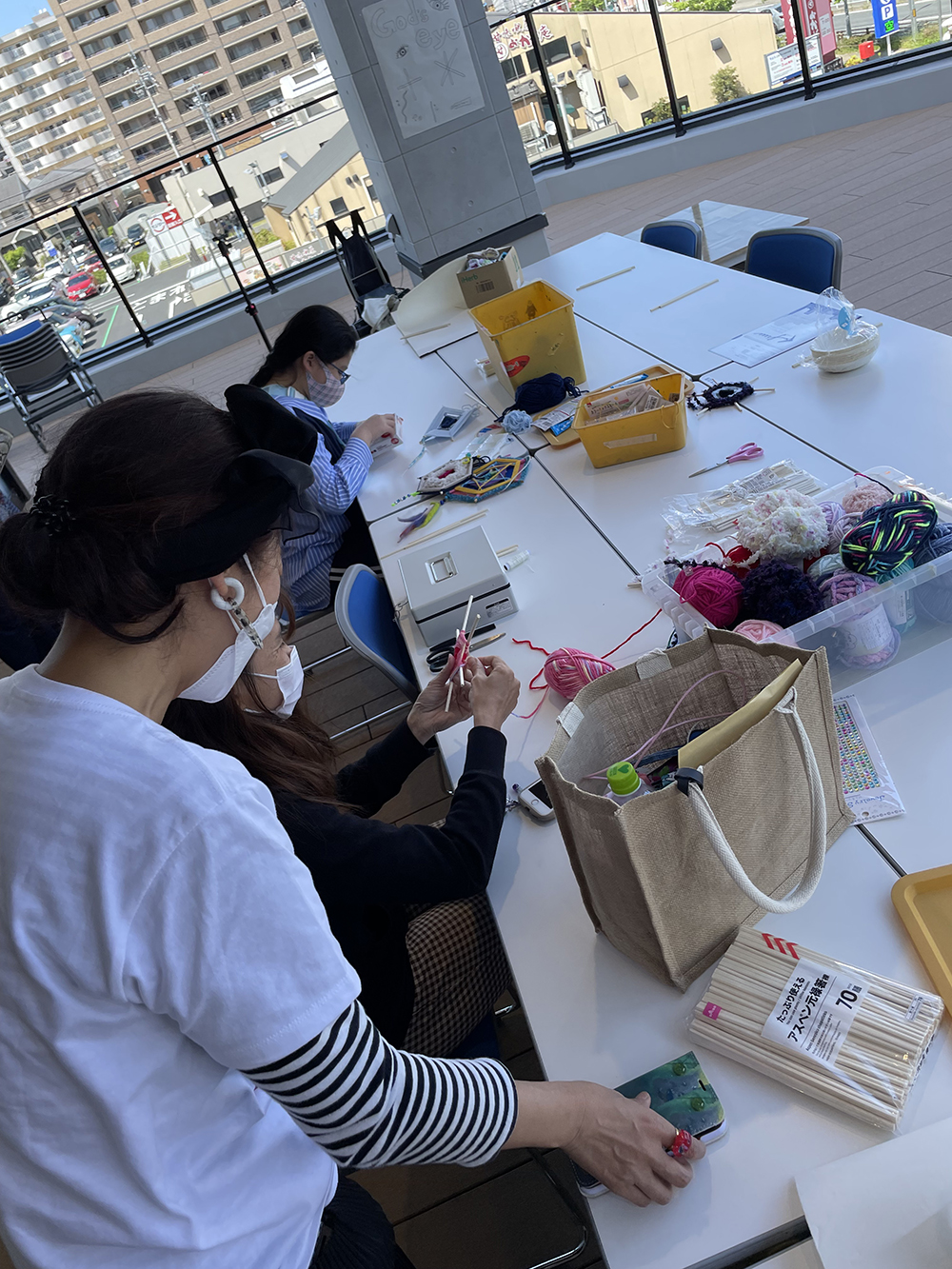6歳ぐらい〜ご年配まで楽しめるまで楽しめる毛糸で作るお守り作り。 集客のためのイベント。大人もハマってとても集中します。 見本通りにやらなくて良いと声かけするのがLION ARTSCHOOL流。最初はやり方を何度も聞いていた参加者からは「とても教え方良くて楽しく作れました。」とおっしゃってくれました。