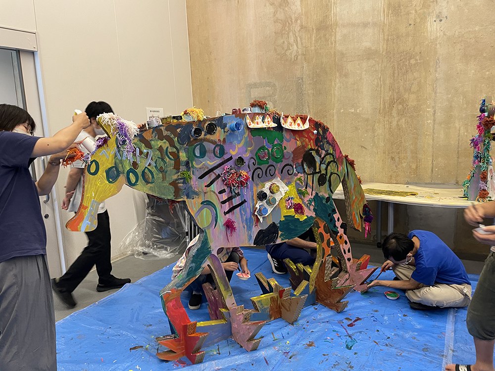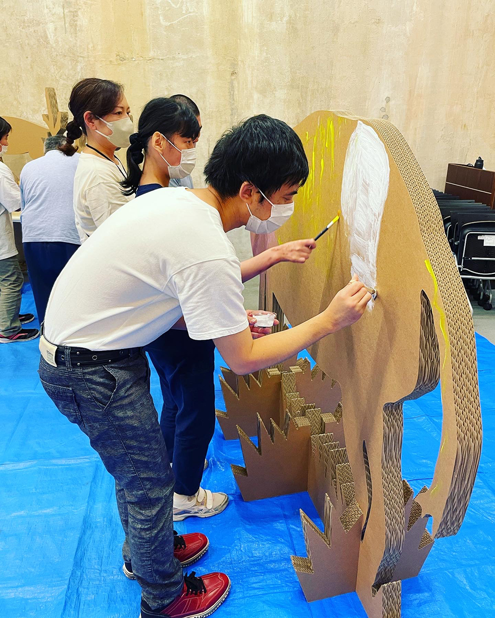 半田赤レンガ建物の広い空間を使って、大きなキャンバスに塗ったり、貼ったり、みんなで南吉さんの物語の世界を作り上げるワークショップです。