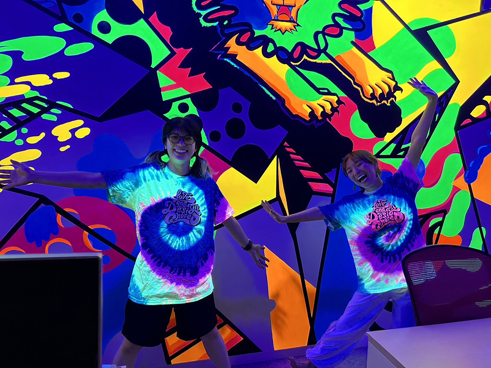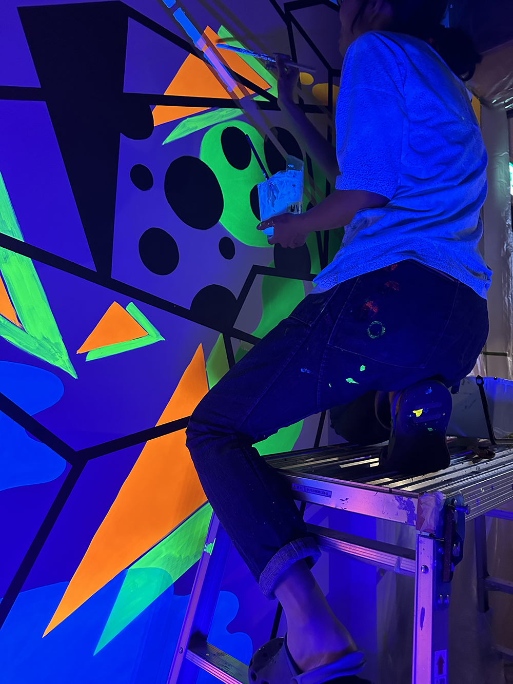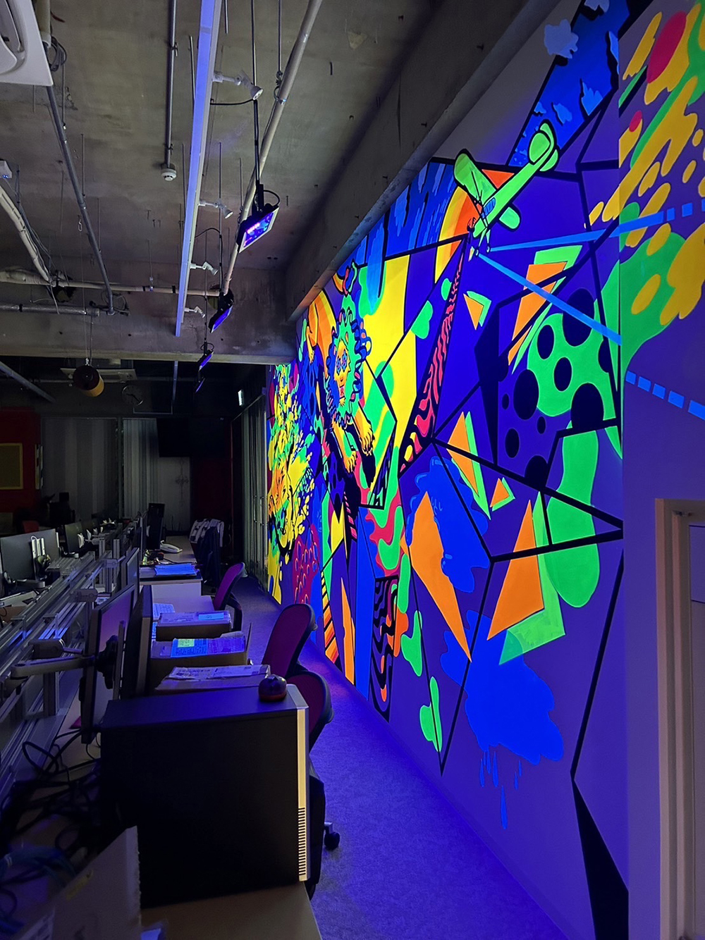 クライアントには打ち合わせの時にインパクトを出したい要望で蛍光塗料でも光る塗料にする。