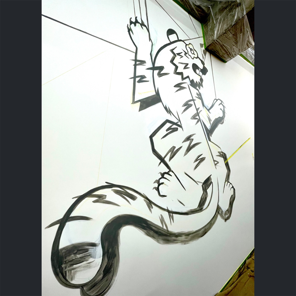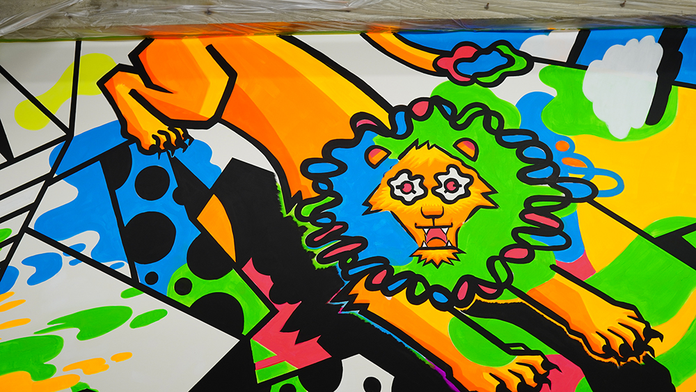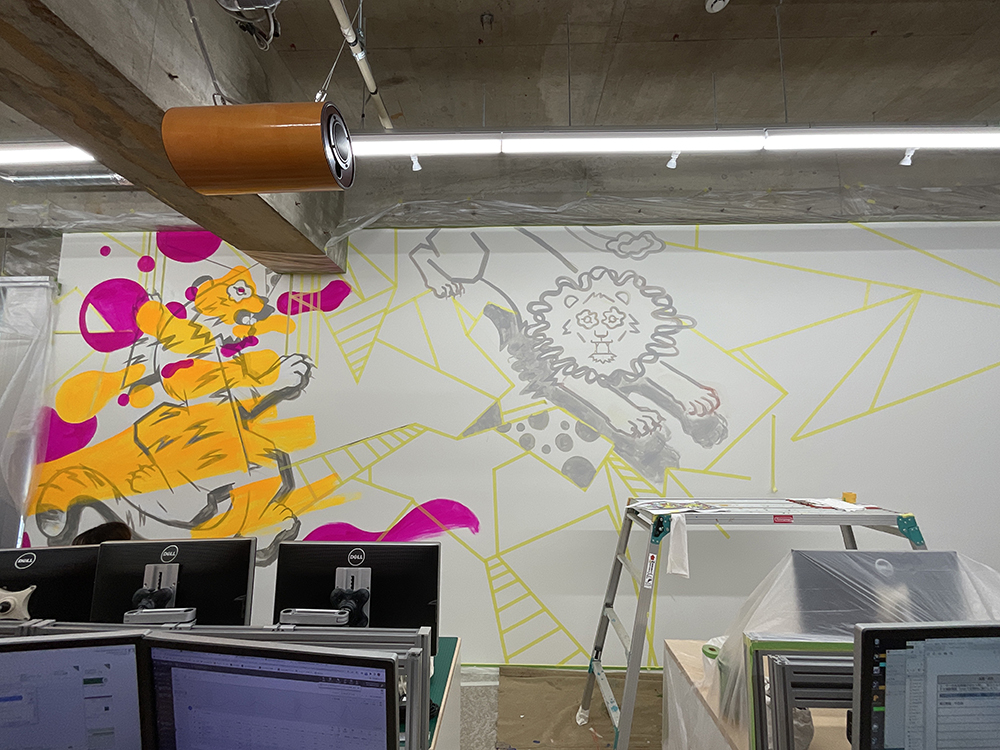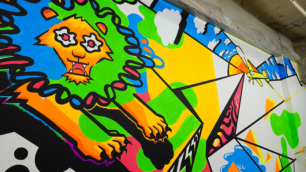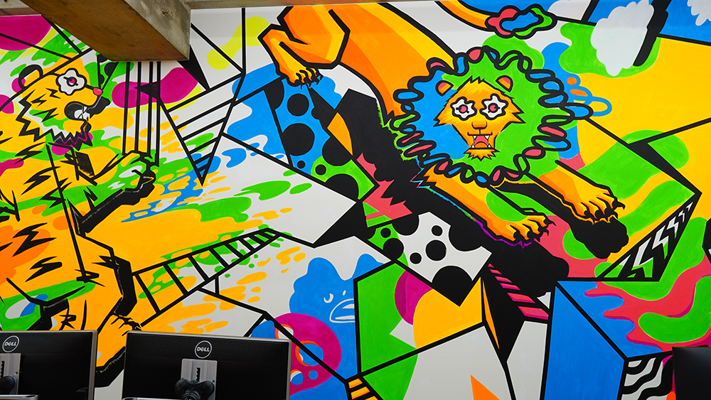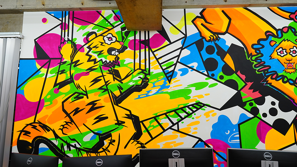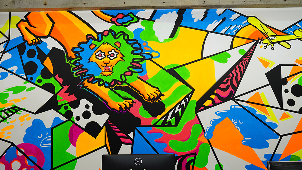 社名の由来である虎とライオン、前会社の名前の由来の飛行機をポップに描く。