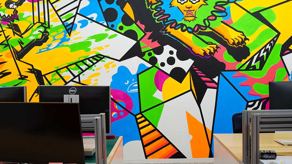 飽きのこない抽象的な背景とトリッキーな線で空間に広がりを出しました。