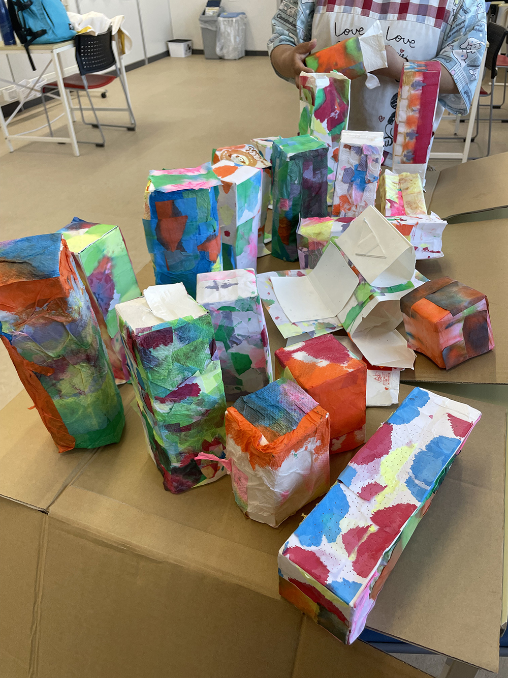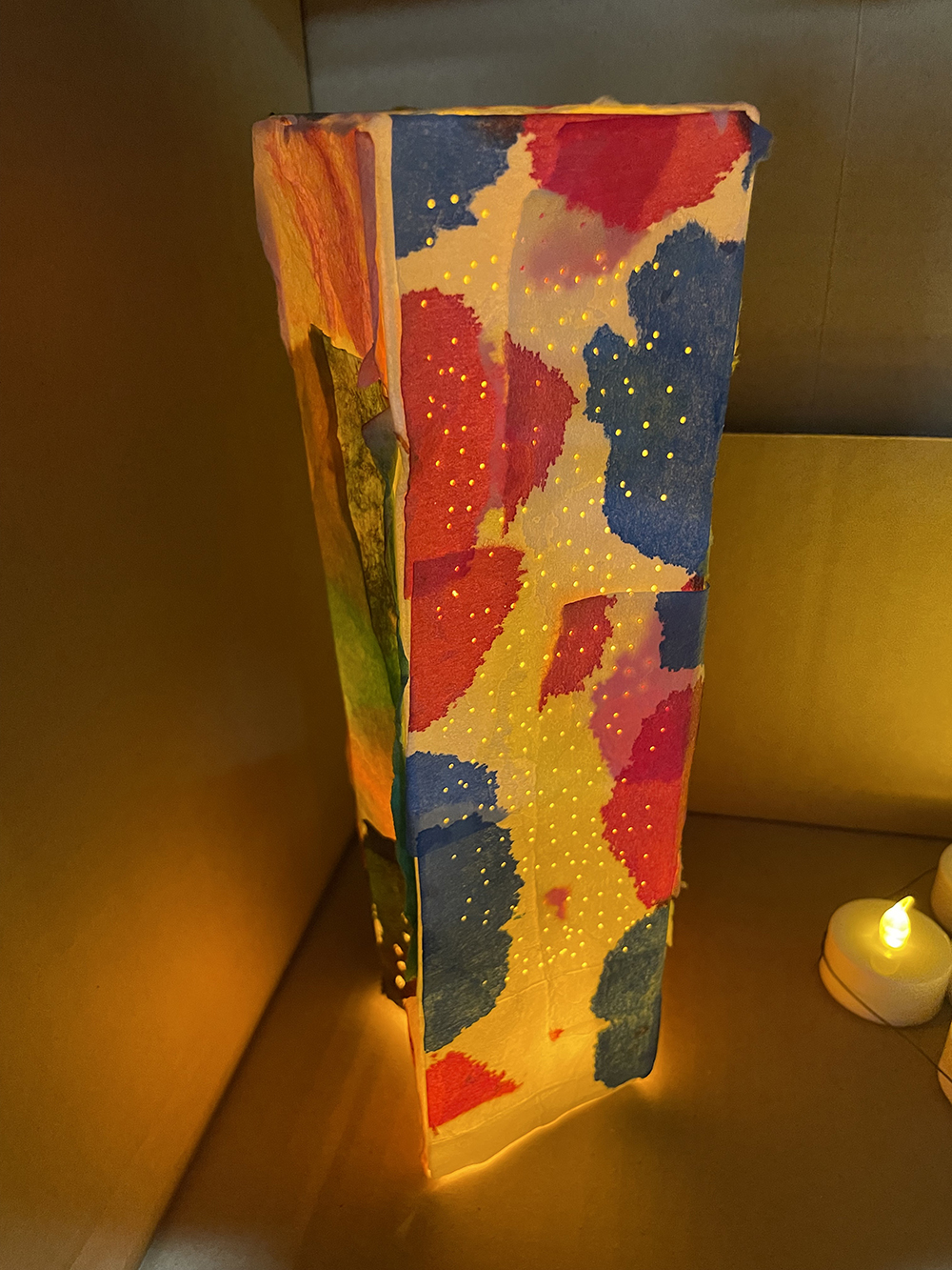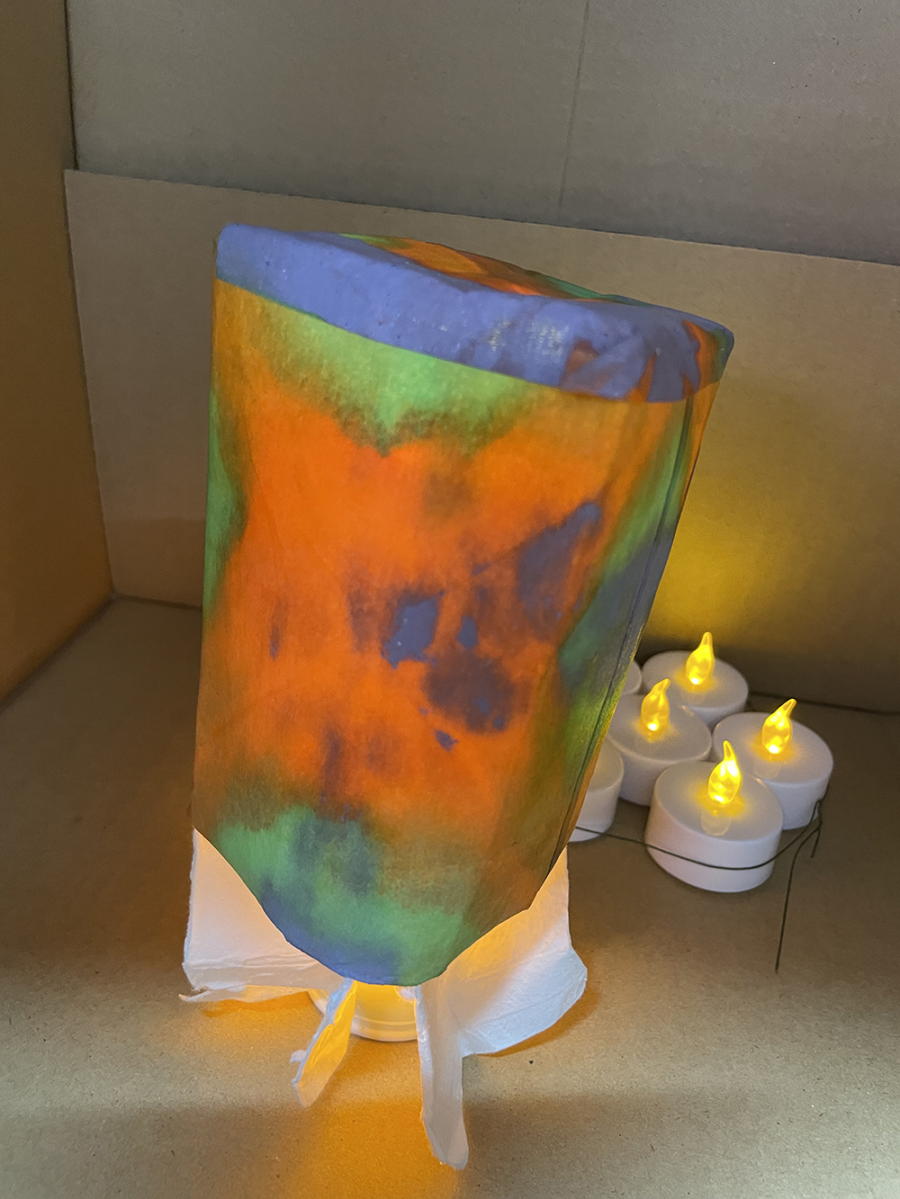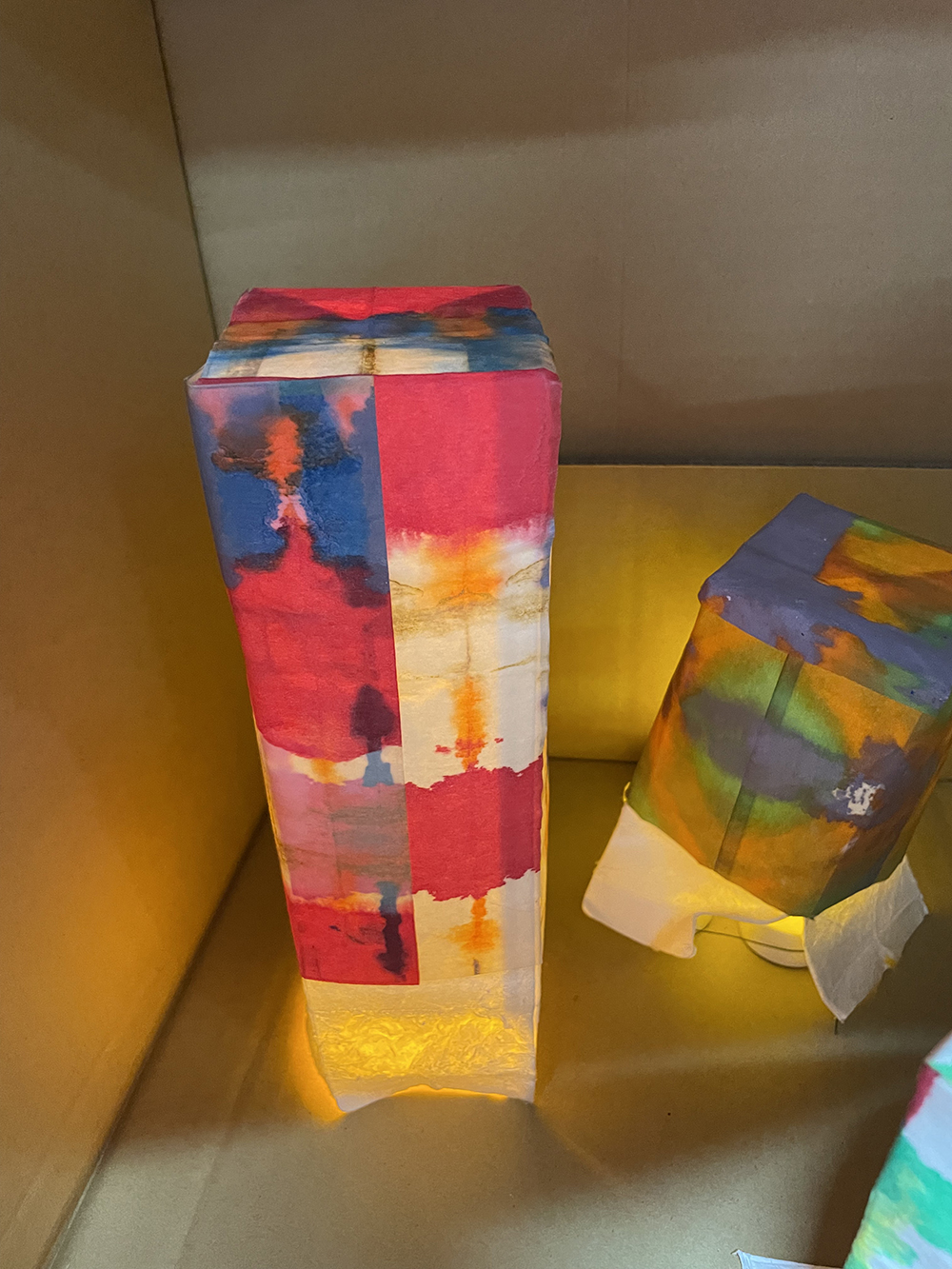 就労支援B型施設AWひまわりにて、紙パックを使ったアートワーク。 様々な色で染めた薄い紙を紙パックに貼って、中にライトを入れました。 貼った時と、ライトをつけたときの見た目の違いに驚き、喜んでいました。 このWSは「紙を染める」「紙を貼る」と2回に分けて制作。お子様から年配までできるワークショップです。