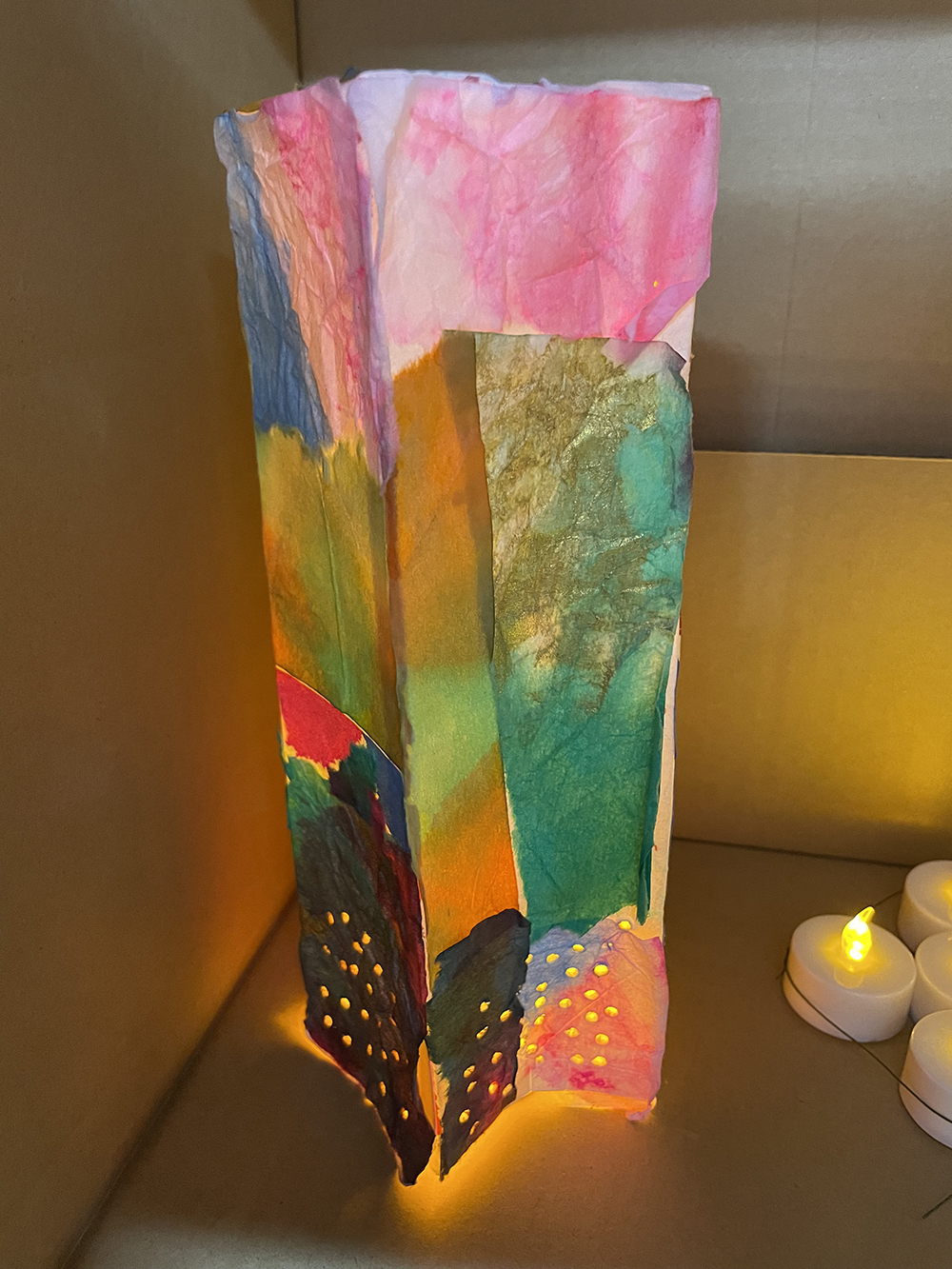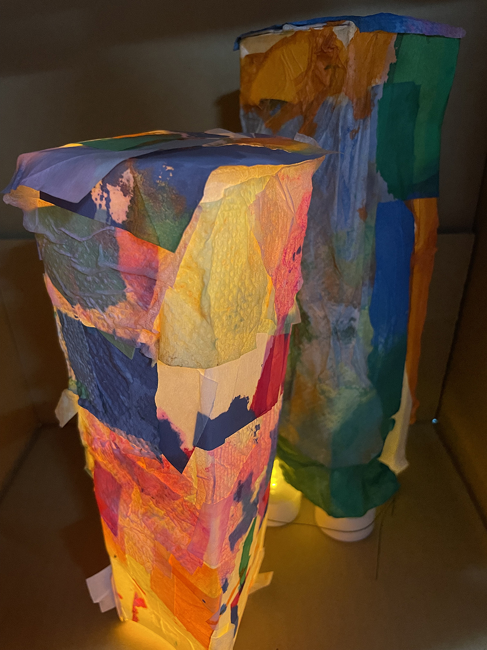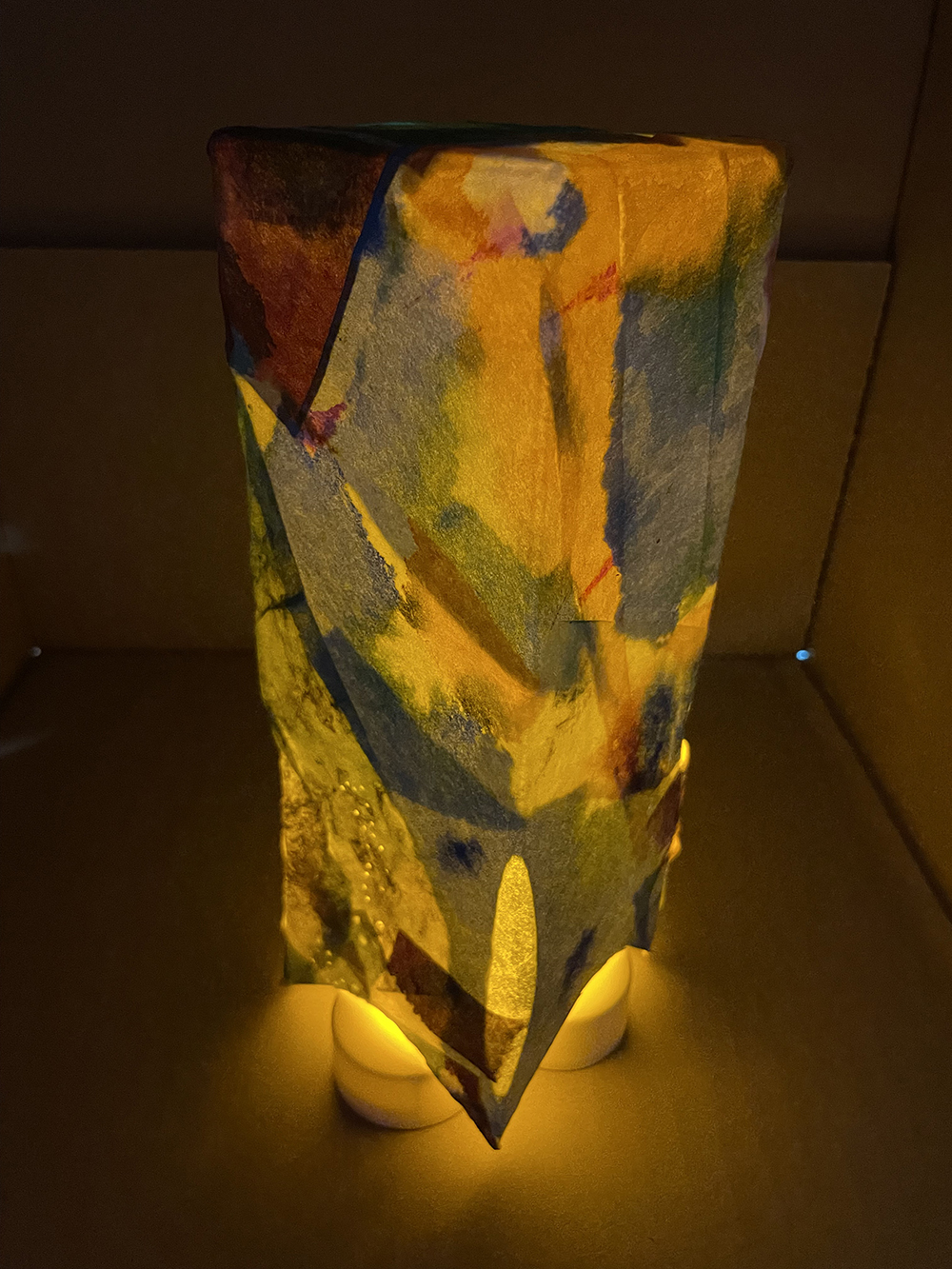 就労支援B型施設AWひまわりにて、紙パックを使ったアートワーク。 様々な色で染めた薄い紙を紙パックに貼って、中にライトを入れました。 貼った時と、ライトをつけたときの見た目の違いに驚き、喜んでいました。 このWSは「紙を染める」「紙を貼る」と2回に分けて制作。お子様から年配までできるワークショップです。