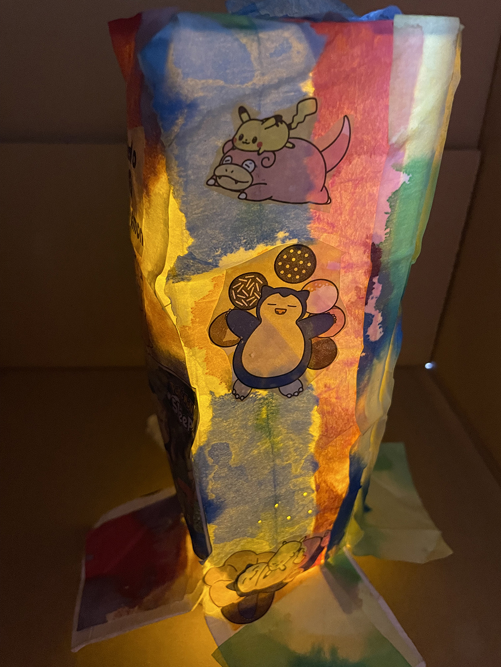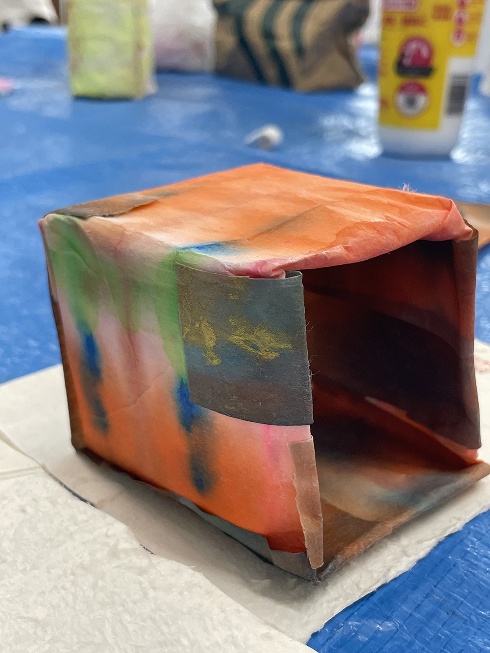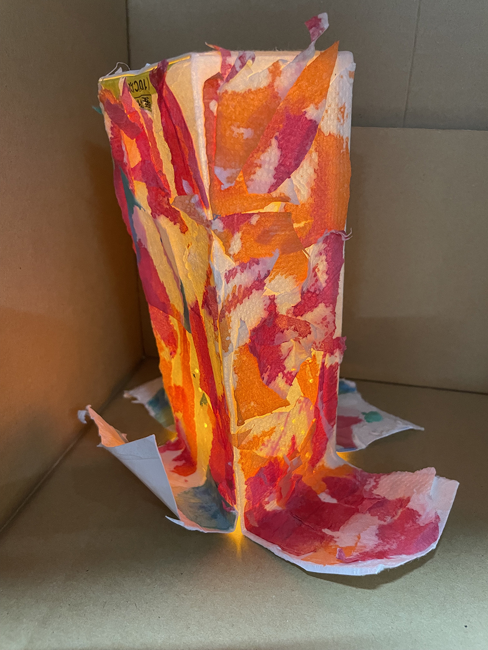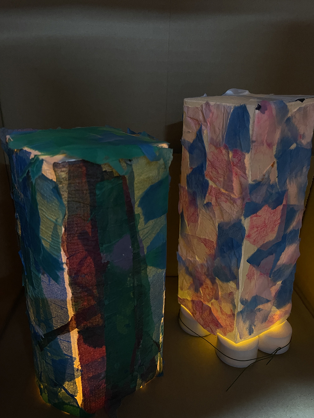 就労支援B型施設AWひまわりにて、紙パックを使ったアートワーク。 様々な色で染めた薄い紙を紙パックに貼って、中にライトを入れました。 貼った時と、ライトをつけたときの見た目の違いに驚き、喜んでいました。 このWSは「紙を染める」「紙を貼る」と2回に分けて制作。お子様から年配までできるワークショップです。