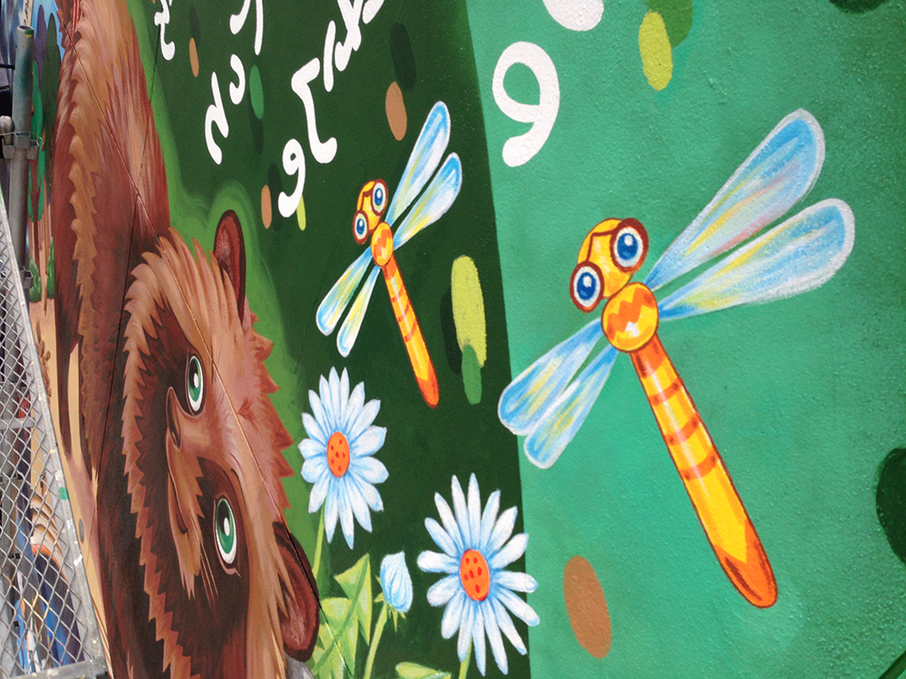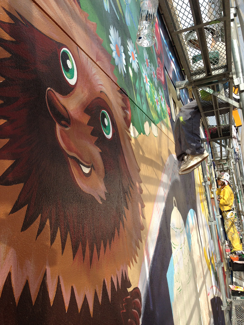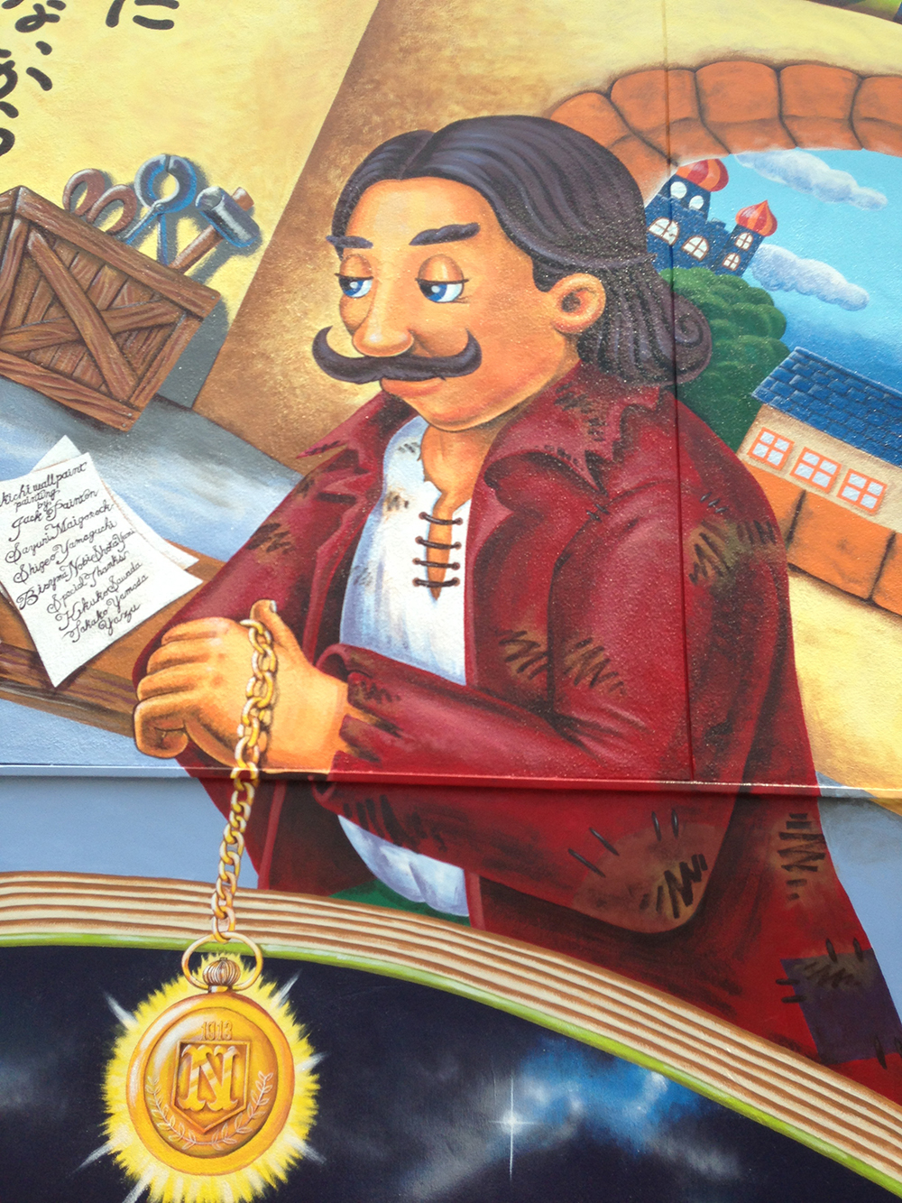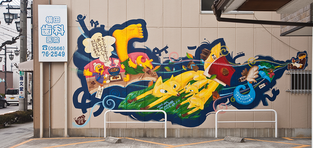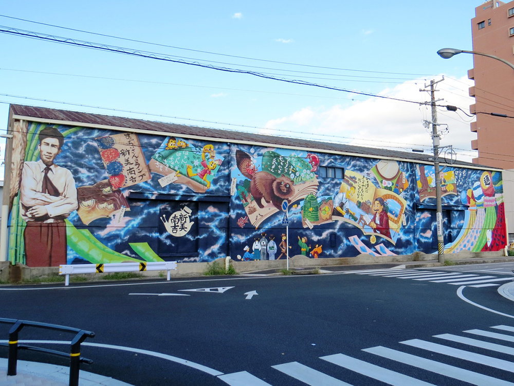 新美南吉が本を開くと3つの童話に出てくるキャラクターが飛び出してくる設定。奥の南吉を小さく、道路側の手前を大きく描いて、ダイナミック感を出した