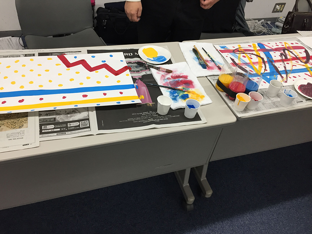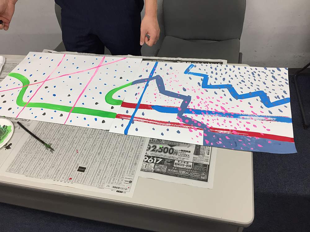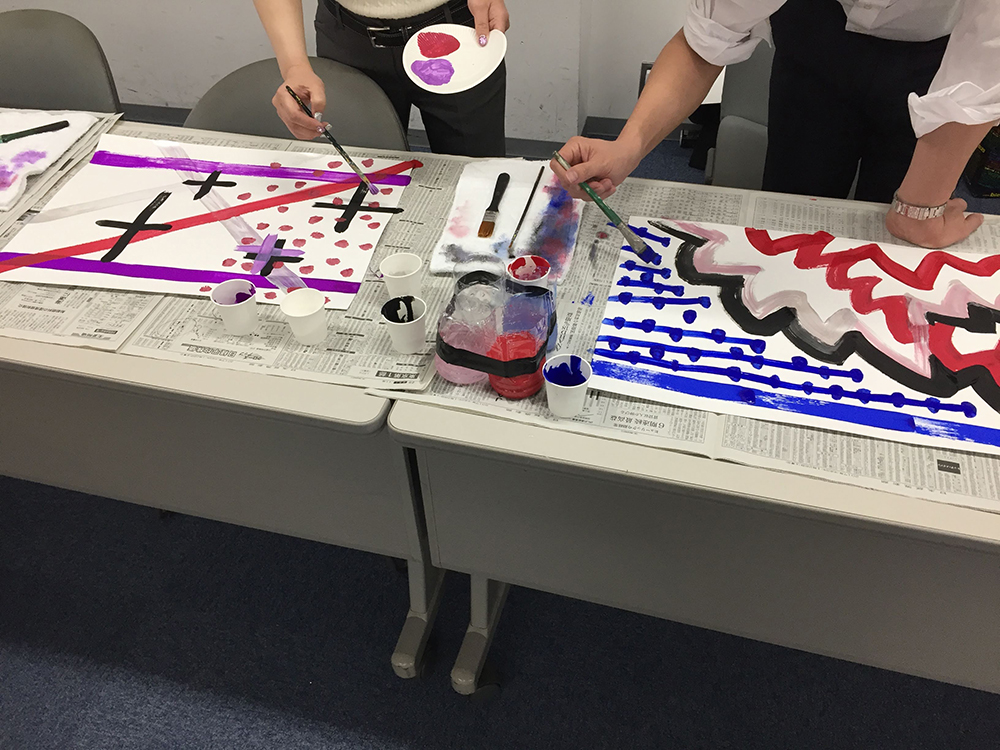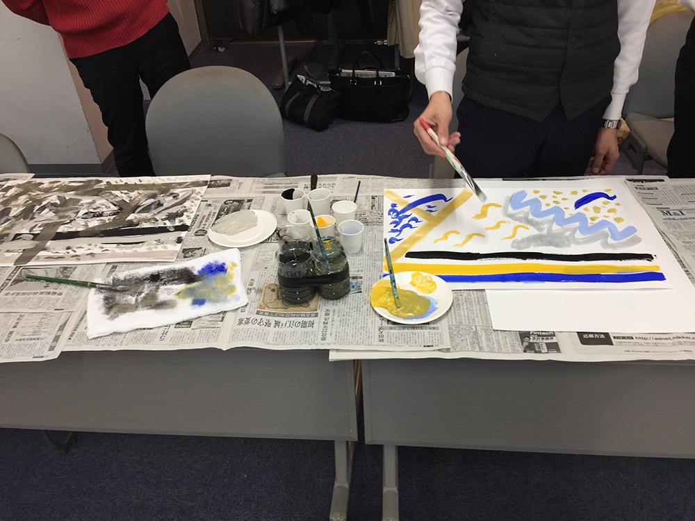 名古屋青年会議所の会員向けWS。若手経営者10名。 好きな色で線や曲線を書いてもらい、隣の人と描いた絵を交換して、続きを書いてもらう。 意識の交換。経営者なので、躊躇することなく、楽しんで進んで描くのが印象的でした。