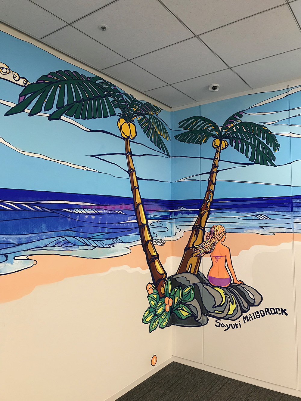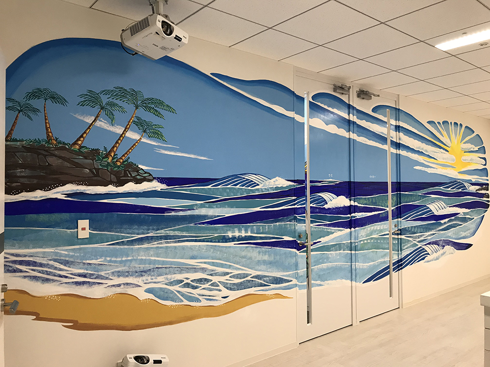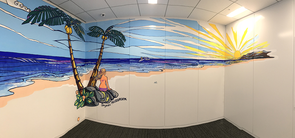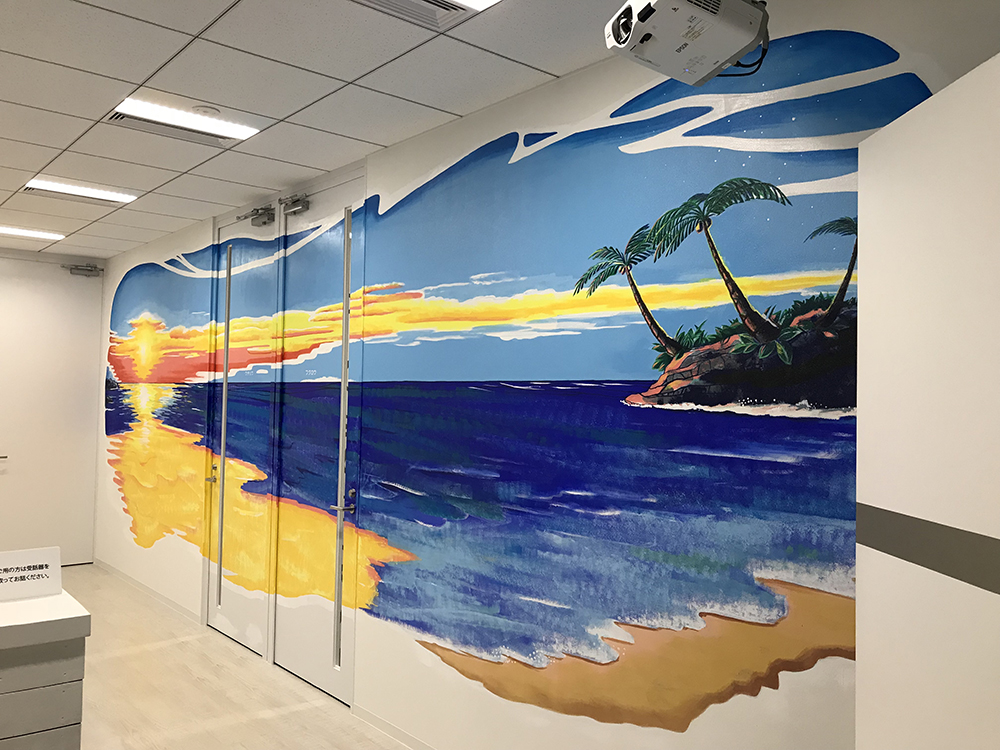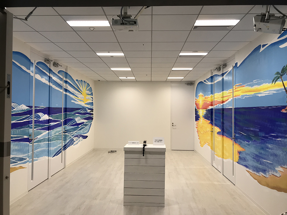 ステンドグラス風の海というテーマ。事業内容とは関係ないが、社員が若く、自由な服装なので、社員が楽しく過ごせる環境とクライアントへのインパクトを重視