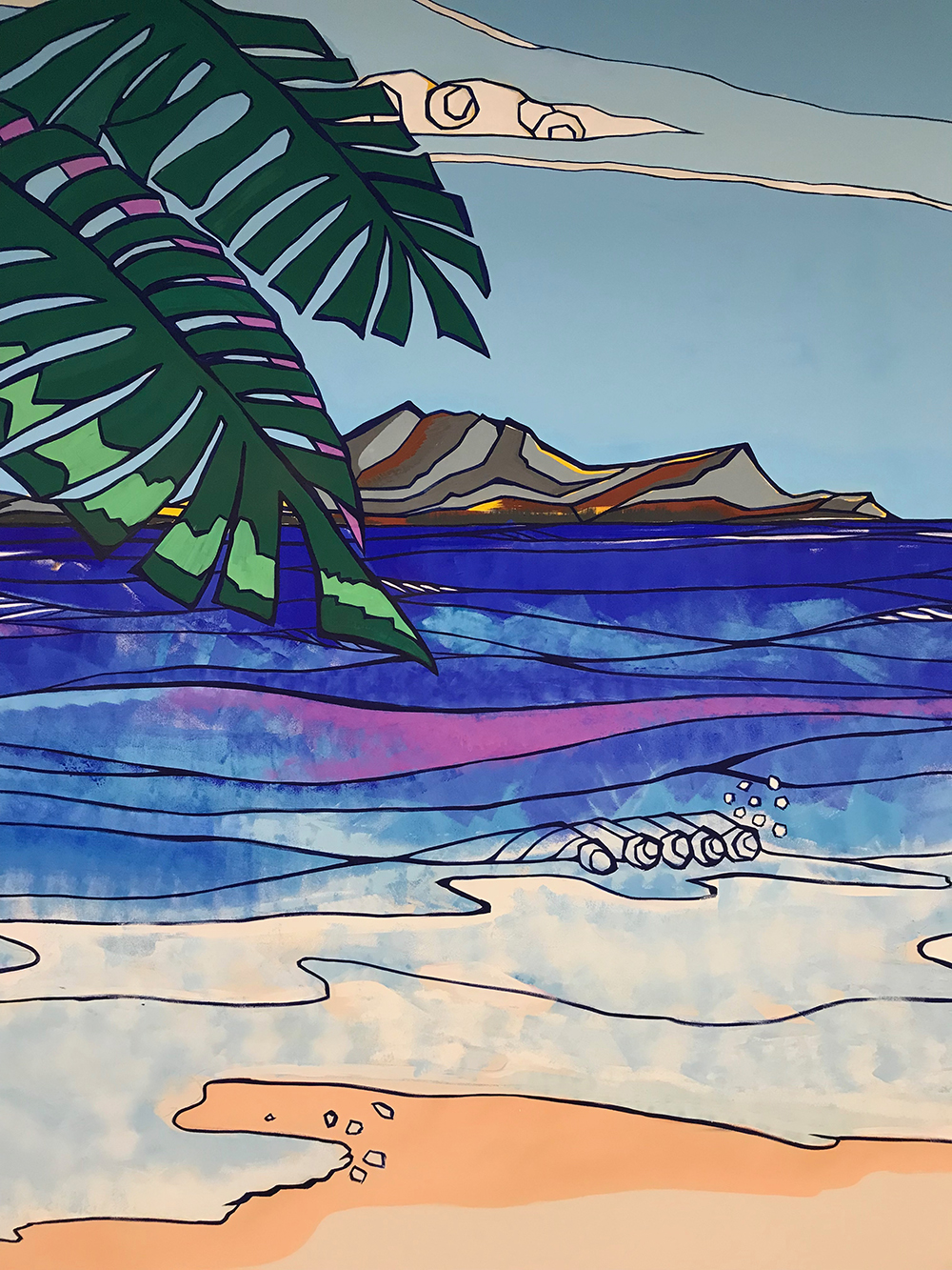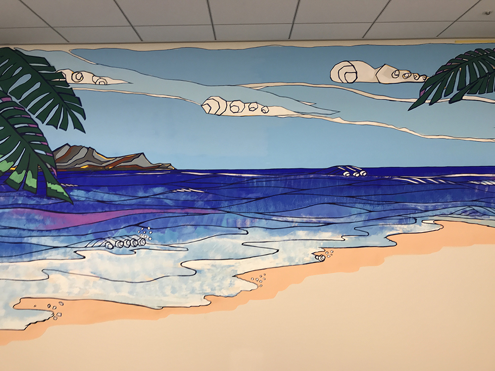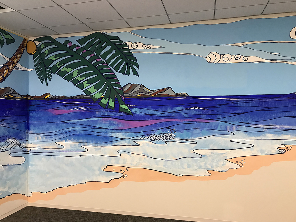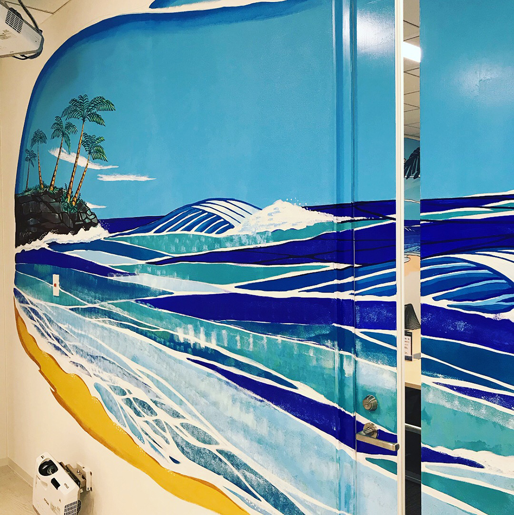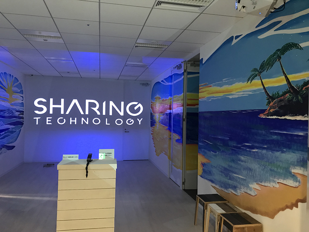 ステンドグラス風の海というテーマ。事業内容とは関係ないが、社員が若く、自由な服装なので、社員が楽しく過ごせる環境とクライアントへのインパクトを重視